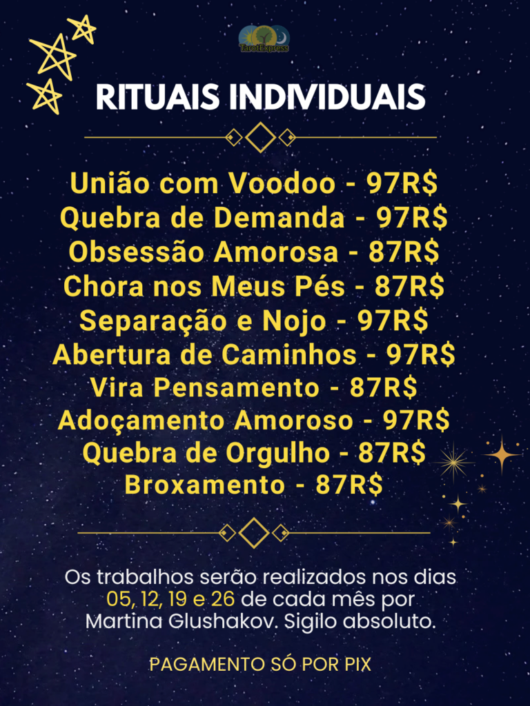 Martina Glushakov do Canal Tarot Express é Psicanalista, Operadora de Radiestesia e Mesa Radiônica, Cartomante e Taróloga, Vidente, Sensitiva e Médium. Também é uma Sacerdotisa Celta, Druidisa e praticante de magia ancestral, angelical e salomônica. No passado já exerceu outras profissões acadêmicas como advogada e contadora. Atualmente se dedica a cumprir sua missão espiritual.